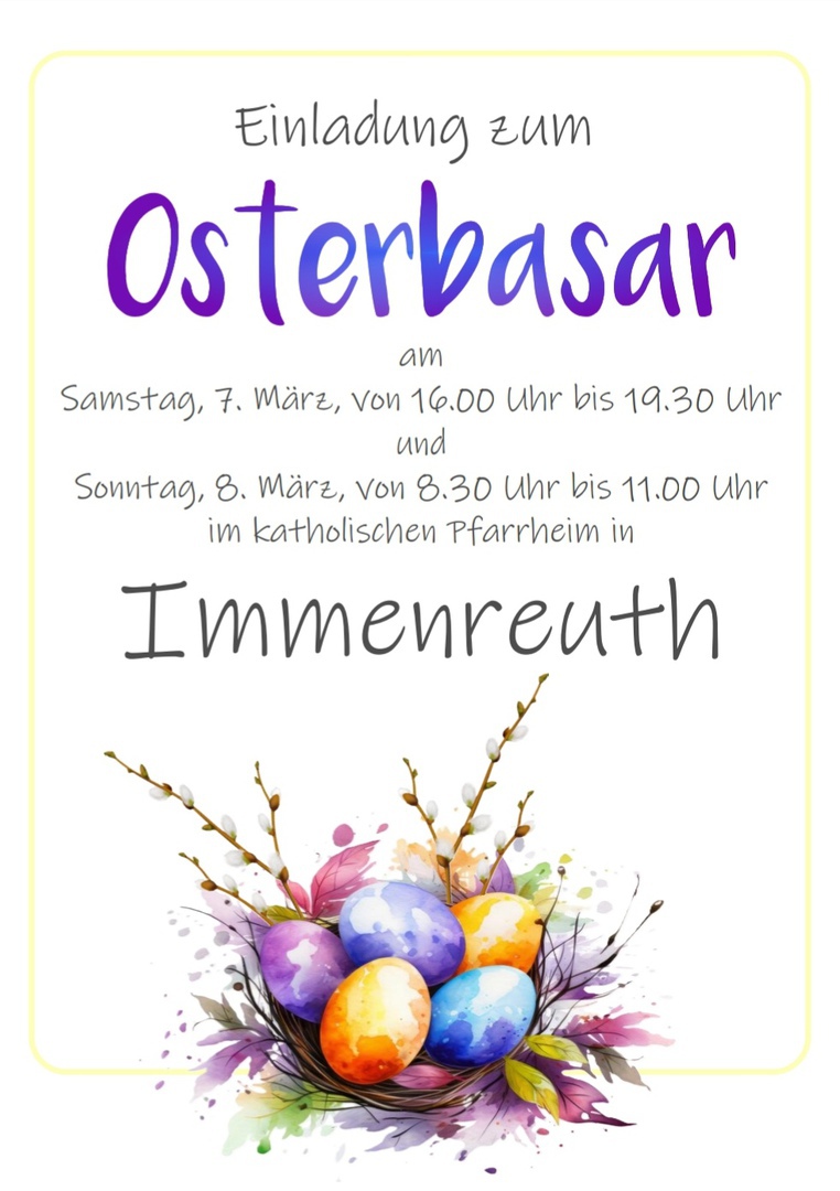 Die Herz-Jesu-Pfarrei lädt herzlich zum diesjährigen Osterbasar ins katholische Pfarrheim ein. Der Basar findet am Samstag, den 7. März, von 16.00 bis 19.30 Uhr sowie am Sonntag, 8. März, von 8.30