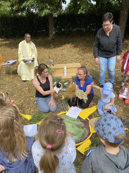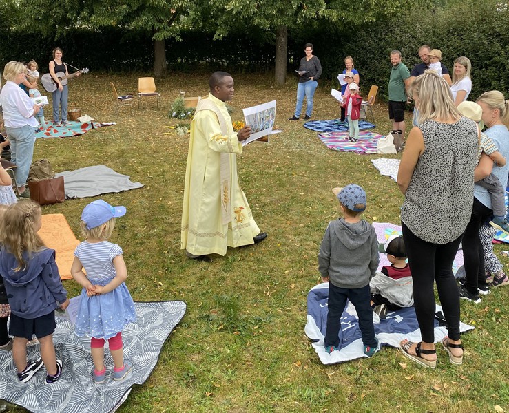 Farbenfroh und lebendig feierten die Jüngsten der Pfarrei das Fest Mariä Himmelfahrt im Pfarrgarten. Sie erlebten dort einen Kleinkindergottesdienst bei dem Kräuter und Blumen im Mittelpunkt standen.