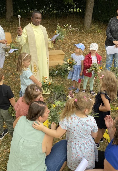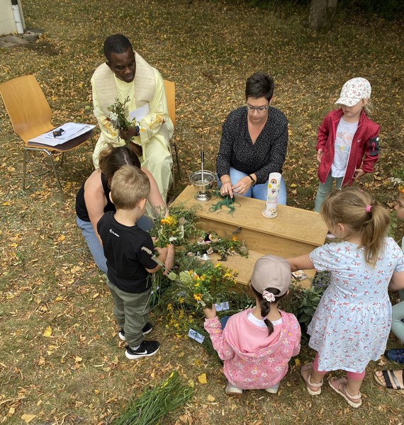 Die Kinder banden voller Eifer ihre eigenen bunten Kräuterbuschen für zu Hause, die von Pfarrvikar Dr. Linus abschließend gesegnet wurden – ein Gottesdienst, der alle Sinne der jüngsten