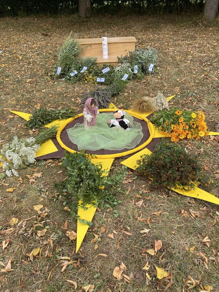 In der Mitte einer großen gelben Papiersonne traf das Maskottchen "Flecki" auf Maria. Beide entdeckten gemeinsam mit den Kindern die auf den Strahlen vorbereiteten Blumen und Kräuter. Es wurde der